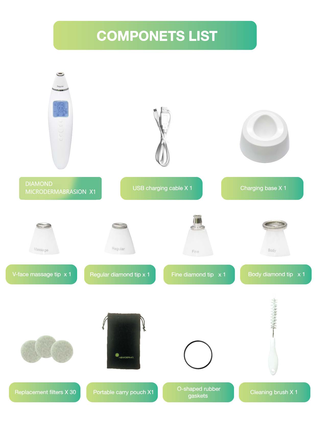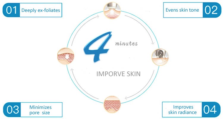 El dispositivo está diseñado exclusivamente para exfoliar la piel, estimular el crecimiento de nuevas células saludables y estimular la circulación sanguínea en la piel para una tez más suave y fresca. Con excelente función lifting y reparadora, tensa las fibras elásticas y reduce las venas finas para mantener la piel tersa, hidratada y brillante.
