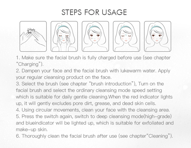 Assurez-vous que la brosse pour le visage est complètement chargée avant utilisation (voir le chapitre charge 2. Humidifiez votre visage et la brosse pour le visage avec de l'eau tiède. Appliquez votre produit de nettoyage régulier sur le visage 3. Sélectionnez la brosse (voir le chapitre Introduction à la brosse"), allumez la brosse pour le visage et sélectionnez Le réglage de la vitesse du mode de nettoyage ordinaire qui convient au nettoyage quotidien en douceur. Lorsque le voyant rouge s'allume, il exclut doucement la saleté des pores, la graisse et les cellules mortes de la peau 4. En utilisant des mouvements circulaires, nettoyez votre visage avec la zone de nettoyage 5. Appuyez à nouveau sur l'interrupteur, Passez en mode de nettoyage en profondeur (haute qualité) et l'indicateur bleu s'allumera, ce qui convient aux peaux exfoliées et maquillées 6. Nettoyez soigneusement la brosse faciale après utilisation (voir le chapitre "Nettoyage")