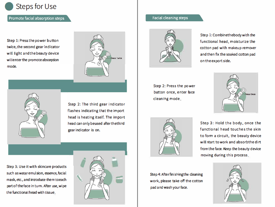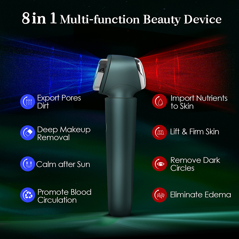 Quando o lado da importação funciona, são liberados íons negativos, que importam nutrientes para a pele com eficiência e melhoram a penetração dos produtos para a pele, ajudando a resolver vários problemas de pele. Entretanto está equipado com LED Azul& Terapia de ondas de luz vermelha;