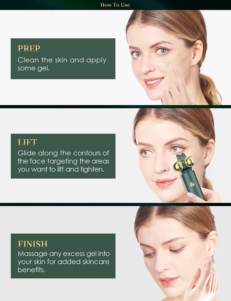 3. Depois de terminar o processo de lifting, massageie o gel restante no rosto até que seja totalmente absorvido ou Enxágue com água limpa e limpe a cabeça funcional com uma toalha de papel.