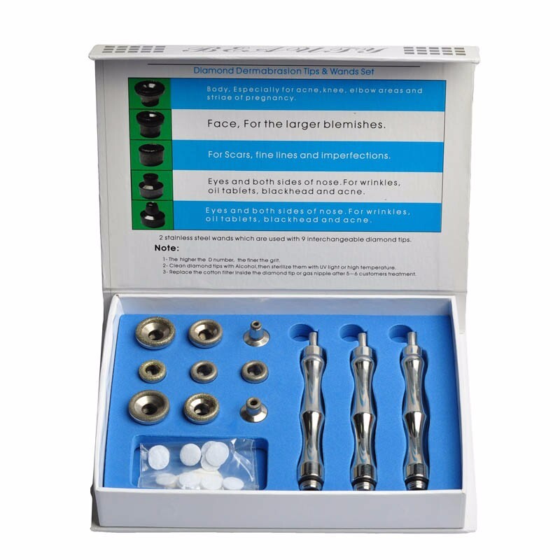 Diamond dermabrasion/microdermabrasion tips and wand are the main components in the microdermabrasion machine.